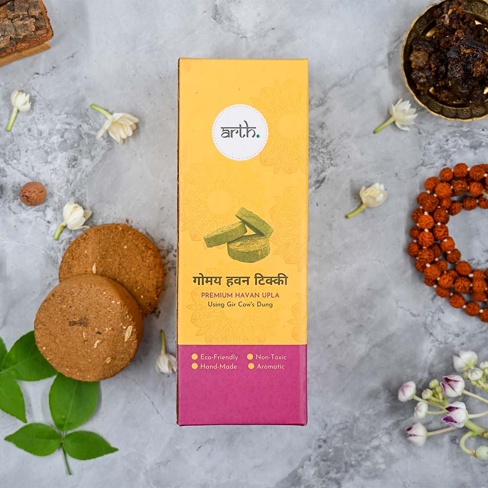 Panchgavya Havan Tikki is a natural and organic product that creates a pure, divine and fragrant atmosphere for your pooja or other festivities. It also has medicinal properties that remove the negativities and enhance the positivity and wellness in your life. It is made from sacred Gir cow’s panchgavya and ancient Ayurvedic herbs that have spiritual and therapeutic benefits