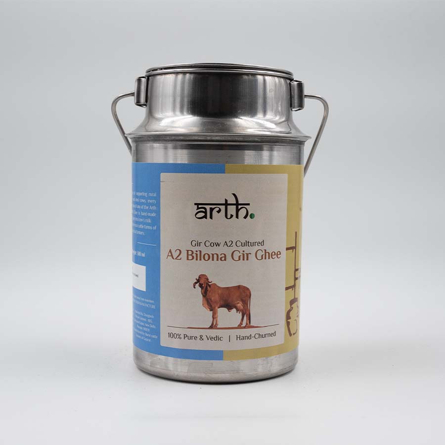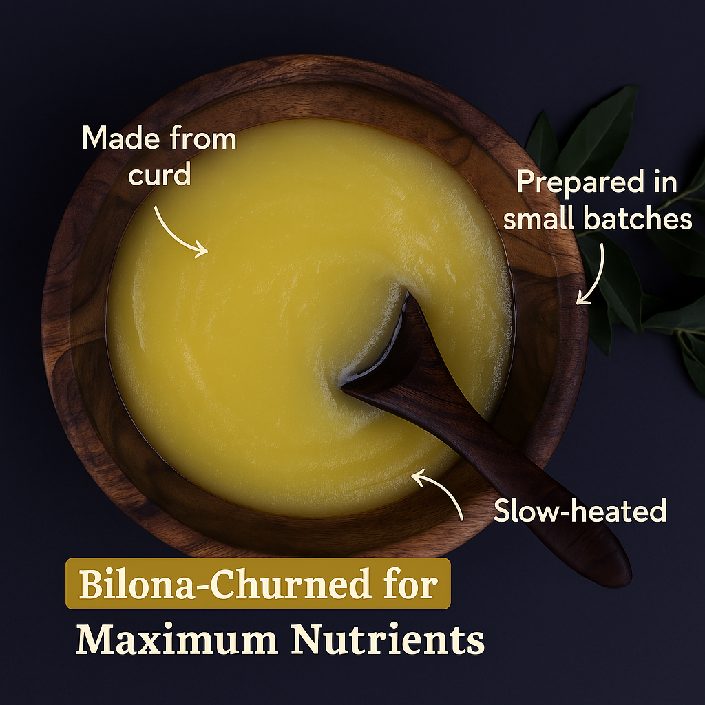 Bilona churning is a traditional method of making ghee, in which the fresh A2 milk of Gir cows is first converted into curd, then churned by hand to separate the butter, and then heated to make ghee. This process preserves the natural nutrients and flavor of the ghee, and also ensures that no chemicals or additives are used in the production.