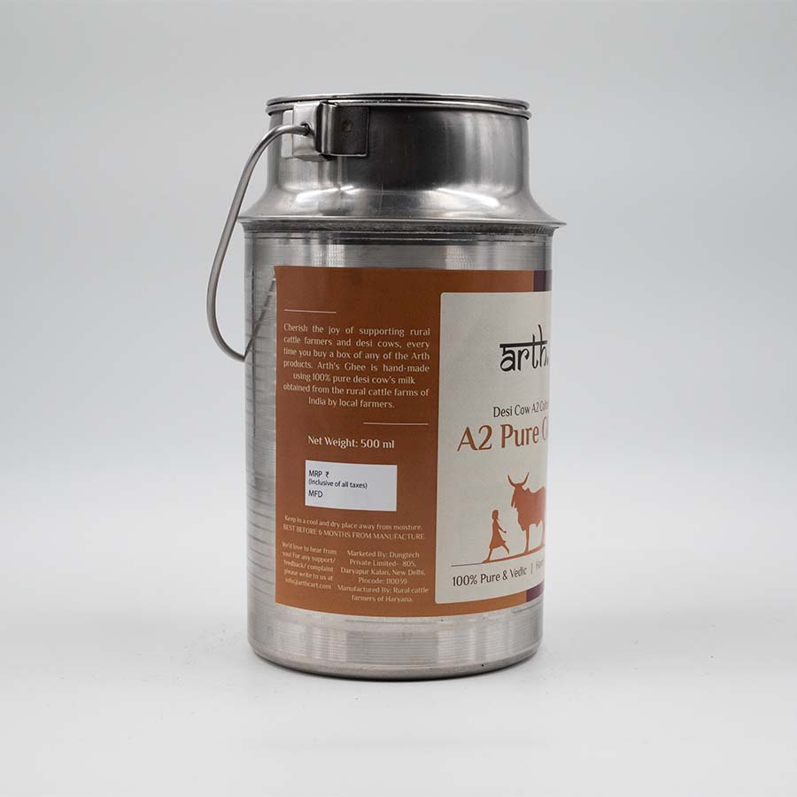 A2 Pure ghee is made from natural A2 milk sourced from gaushalas, where the cows are treated with care and respect. The milk is first converted into curd, then churned by hand to separate the butter, and then heated to make ghee. The only ingredient in A2 Pure ghee is pure cow butter, which contains no additives or preservatives.